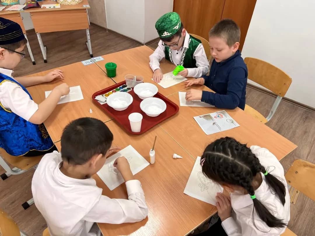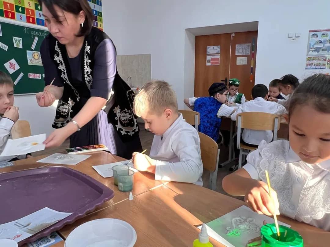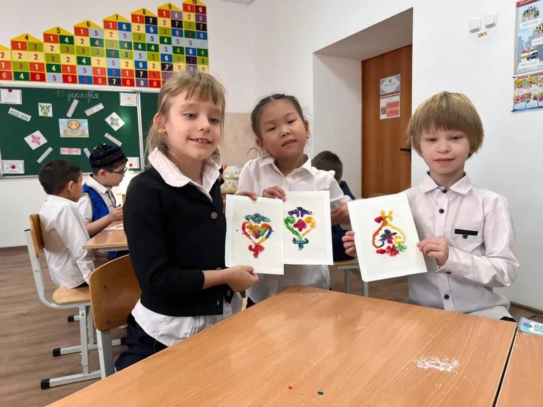 Особый интерес у учащихся вызвала практическая часть — изготовление орнамента солью. Дети были по-настоящему увлечены необычной техникой выполнения рисунка, которая позволила им создать красочные и фактурные изображения традиционных казахских узоров.