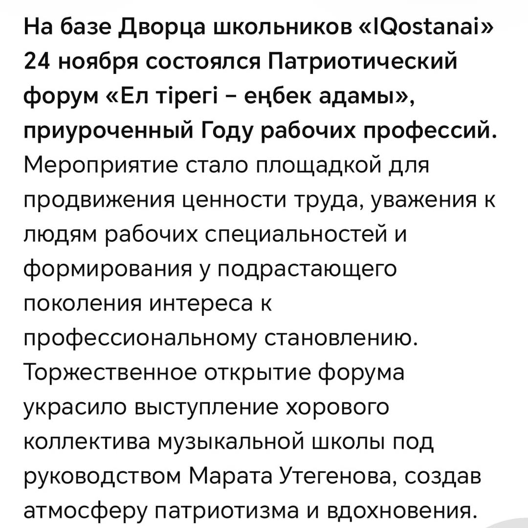 24 ноября во Дворце школьников «IQostanay» прошел патриотический форум «Ел тірегі – Еңбек адамі», посвященный Году рабочих профессий.